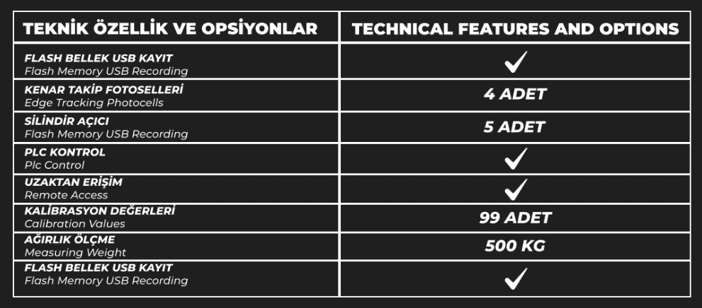 Talep edilen ebatlarda ve kumaş cinsine uygun üretim – Kumaşları esnetmeden kontrol ederek rulo sarma yapan makinedir – Kumaş bitiminde ve istenilen metrede makine otomatik olarak durur. – Top sarım düzgünlüğünün sağlanması için kenar takip fotoseli mev- cuttur 4 Adet – Silindir açıçı yardımı ile doğru ve düzgün sarım 5 adet – Her bir kumaş cinsi için ayrı kalibrasyon değerleri tanımlayabilme (99 Adet) – Topun ağırlığını ölçme ve printere bağlanarak barkod etiket yazdırma imkanı – PLC kontrollü üçlü senkronizasyon sistemi ile çekmezlik değerini koruyarak esnetmeden kontrol ve hassas metre ölçüm olanağı – Bilgisayar Destekli Kumaş Kalite Kontrol Sistemi – Ethernet kablo bağlantısıyla uzaktan erişim ve servis imkani – Stok ve kontrol programını makineye uyarlama sistemi